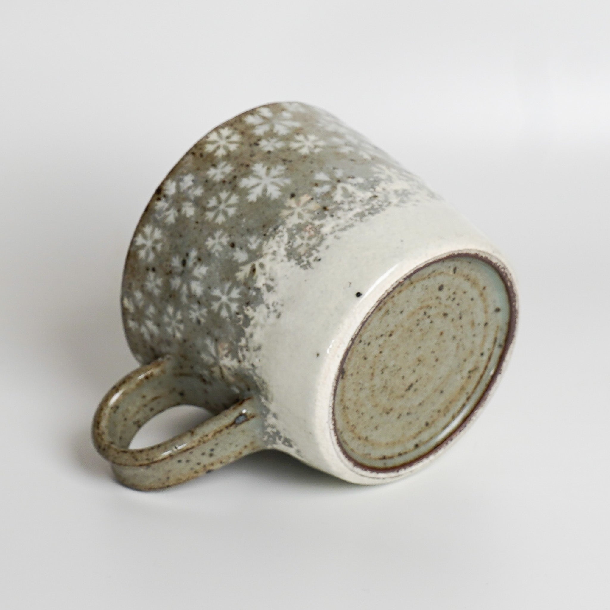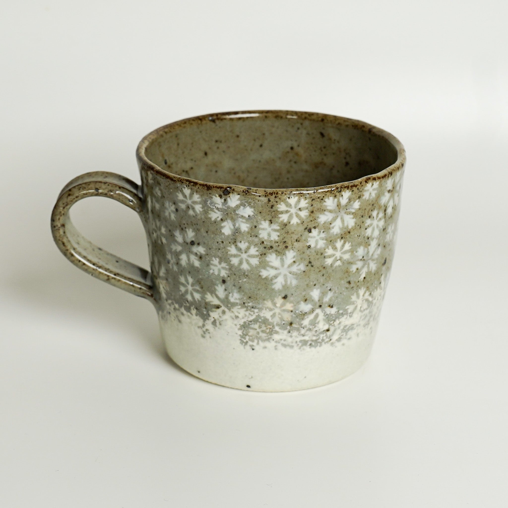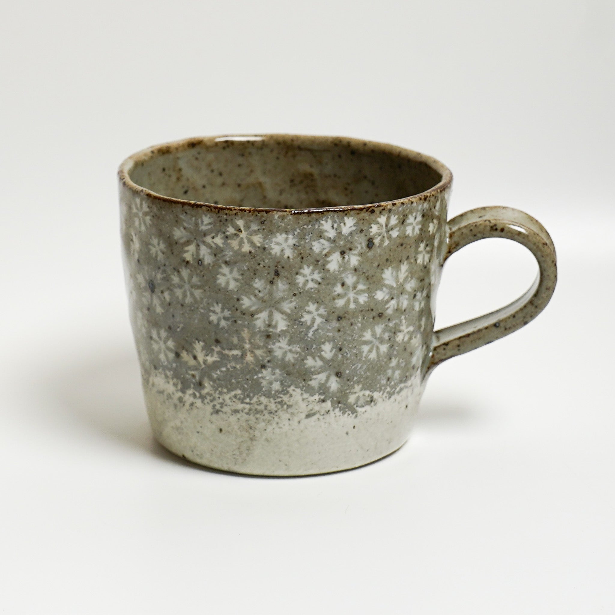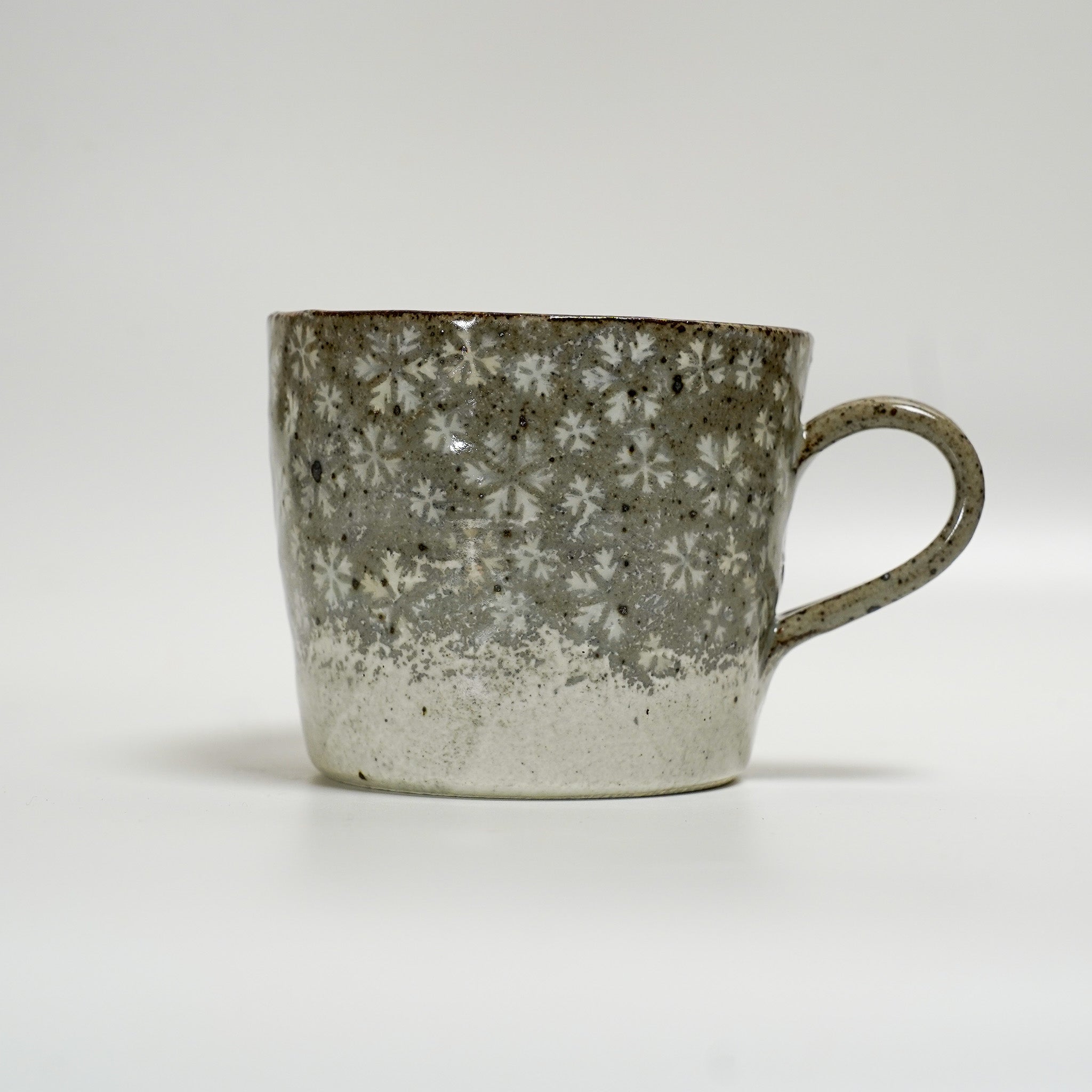 三島手象嵌技法で雪の結晶紋様を施し、灰釉を掛け焼成しています。